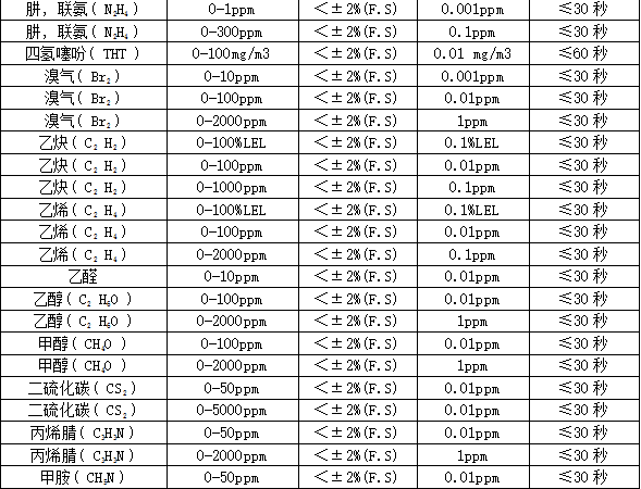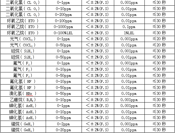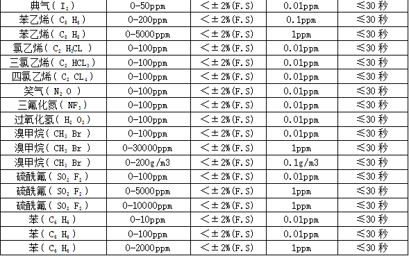 部分可檢測(cè)氣體列表: